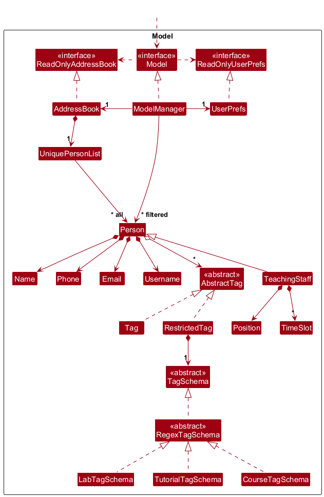 Person) or teaching staff (TeachingStaff), including fields such as name, phone, email, username, and tags. Teaching staff additionally have aPosition(Teaching Assistant or Professors). -
