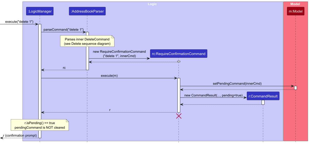 Commandobject (more precisely, an object of one of its subclasses e.g.,DeleteCommand) which is executed by theLogicManager. - The command can communicate with the